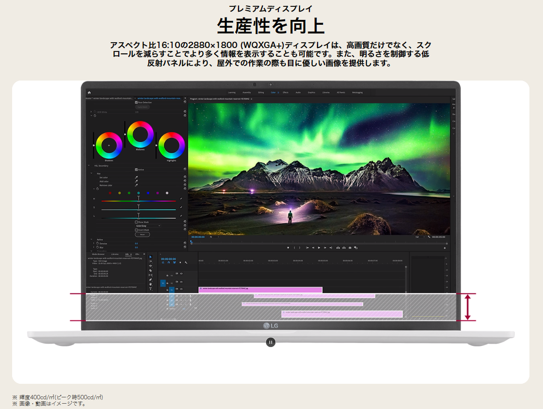 DCI-P3 100%(標準値)の広い色域をカバーし、写真や映像も、より正確な色合いで再現できます。